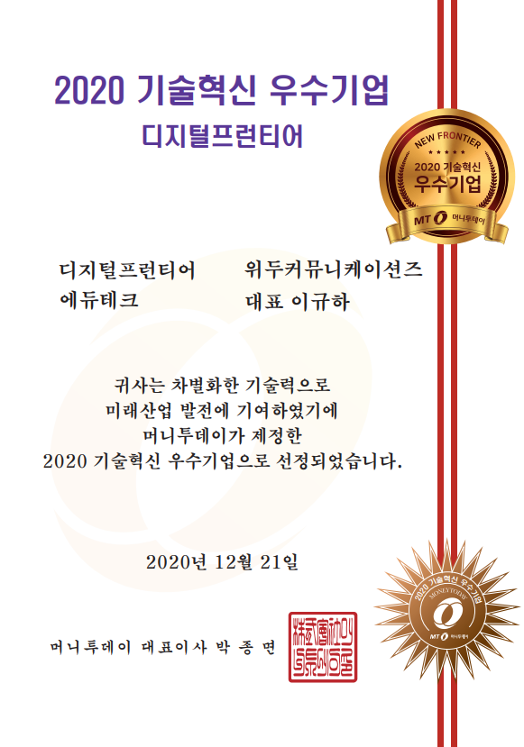2020 기술혁신 우수기업 페이지 정보 작성자 WeDu 댓글 0건 조회 4,578회 작성일 21-12-31 12:58 본문 2020-12-21 2020 기술혁신 우수기업 디지털프런티어 에듀테크 머니투데이 대표이사 List Previous2020 소년한국 우수 어린이 도서 선정 21.12.31 Next2020 서울산업진흥원 2020 DMC어워드 21.12.31