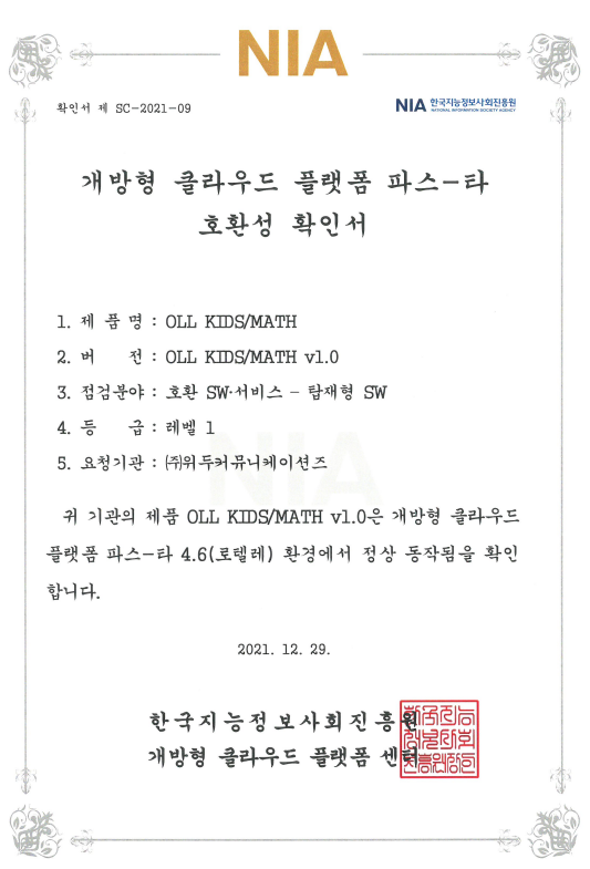 [한국/확인서] OLL KIDS/MATH 파스-타 호환성 확인서 페이지 정보 작성자 WeDu 댓글 0건 조회 7,849회 작성일 21-12-31 12:48 본문 2021-12-29 확인서 제 SC-2021-09 점검분야 : 호환 SW서비스 - 탑재형 SW List Next[한국/인증서] OLL KIDS/MATH 클라우드 서비스 확인서 21.12.31